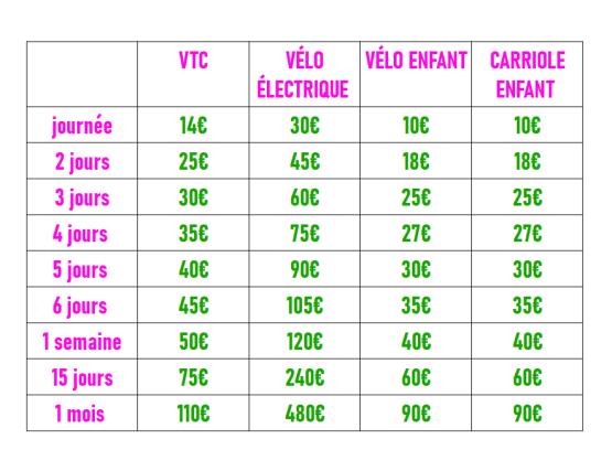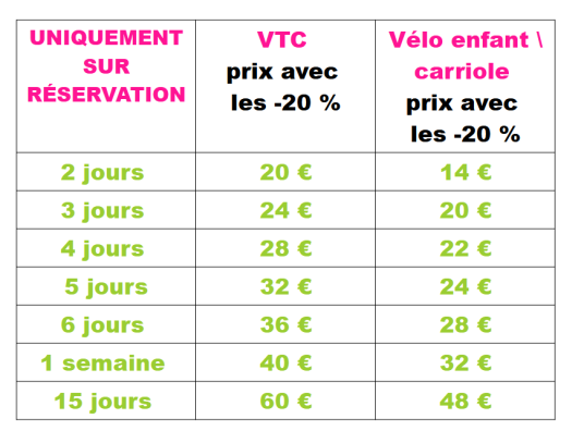 -une rédution de 20% par vélo classique pour toute location de 2 jours ou plus. ( voir les prix sur le tableau ci - dessous)