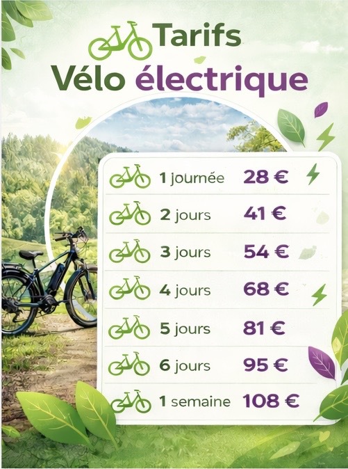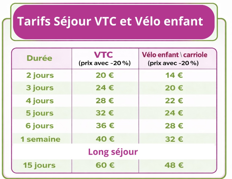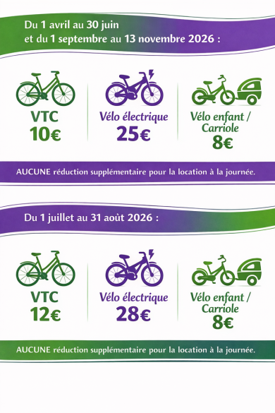 Pensez à réserver à l'avance! Et profitez de réductions avantageuses sur les séjours allant de -10% pour les électriques à - 20% pour les vélos classiques enfants et adultes.